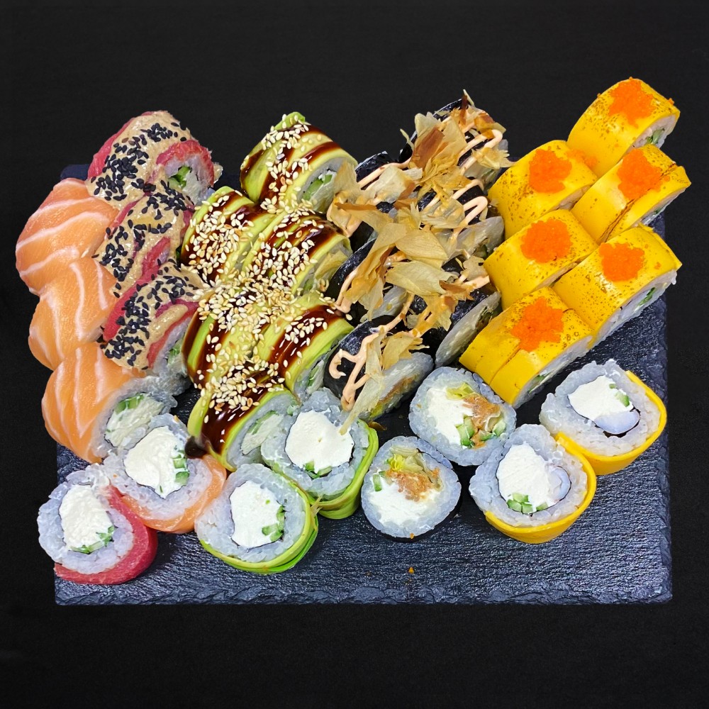Філадельфія класична, Філадельфія з тунцем, Макі з лососем, Макі з креветкою, Червоний дракон, Королівський дракон, Каліфорнія в ікрі з лососем, Дабл чіз з лососем.
